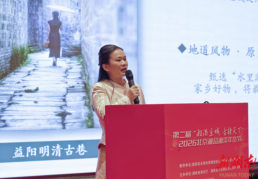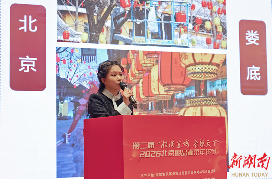2月8日,推荐官在介绍家乡的特色美食。当天,第二届“湘满京城,香辣天下”2026北京湘品湘菜年货节开幕。活动汇聚湖南多地特色农产品及湘菜美食,益阳、衡阳、娄底、常德的推荐官登台推介。本次年货节将持续至2月10日。 湖南日报全媒体记者 徐行 摄