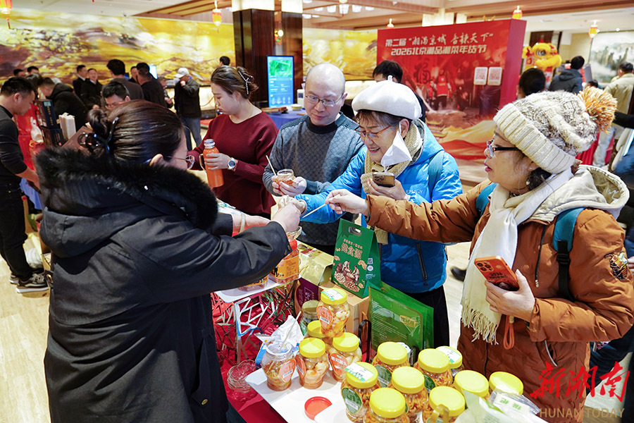 2月8日,消费者在品尝湖南特色美食。当天,第二届“湘满京城,香辣天下”2026北京湘品湘菜年货节开幕。活动汇聚湖南多地特色农产品及湘菜美食,益阳、衡阳、娄底、常德的推荐官登台推介。本次年货节将持续至2月10日。 湖南日报全媒体记者 徐行 摄