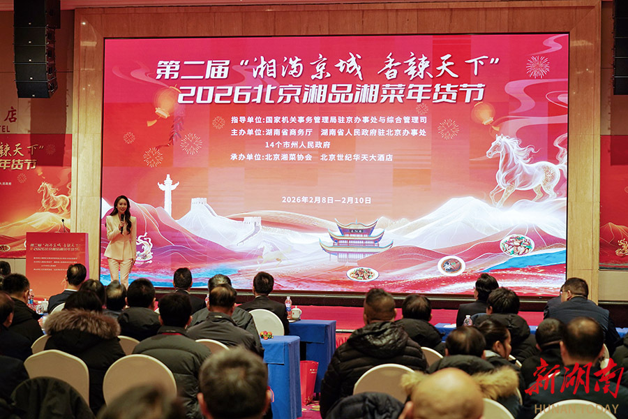 2月8日,第二届“湘满京城,香辣天下”2026北京湘品湘菜年货节开幕。活动汇聚湖南多地特色农产品及湘菜美食,益阳、衡阳、娄底、常德的推荐官登台推介。本次年货节将持续至2月10日。 湖南日报全媒体记者 徐行 摄