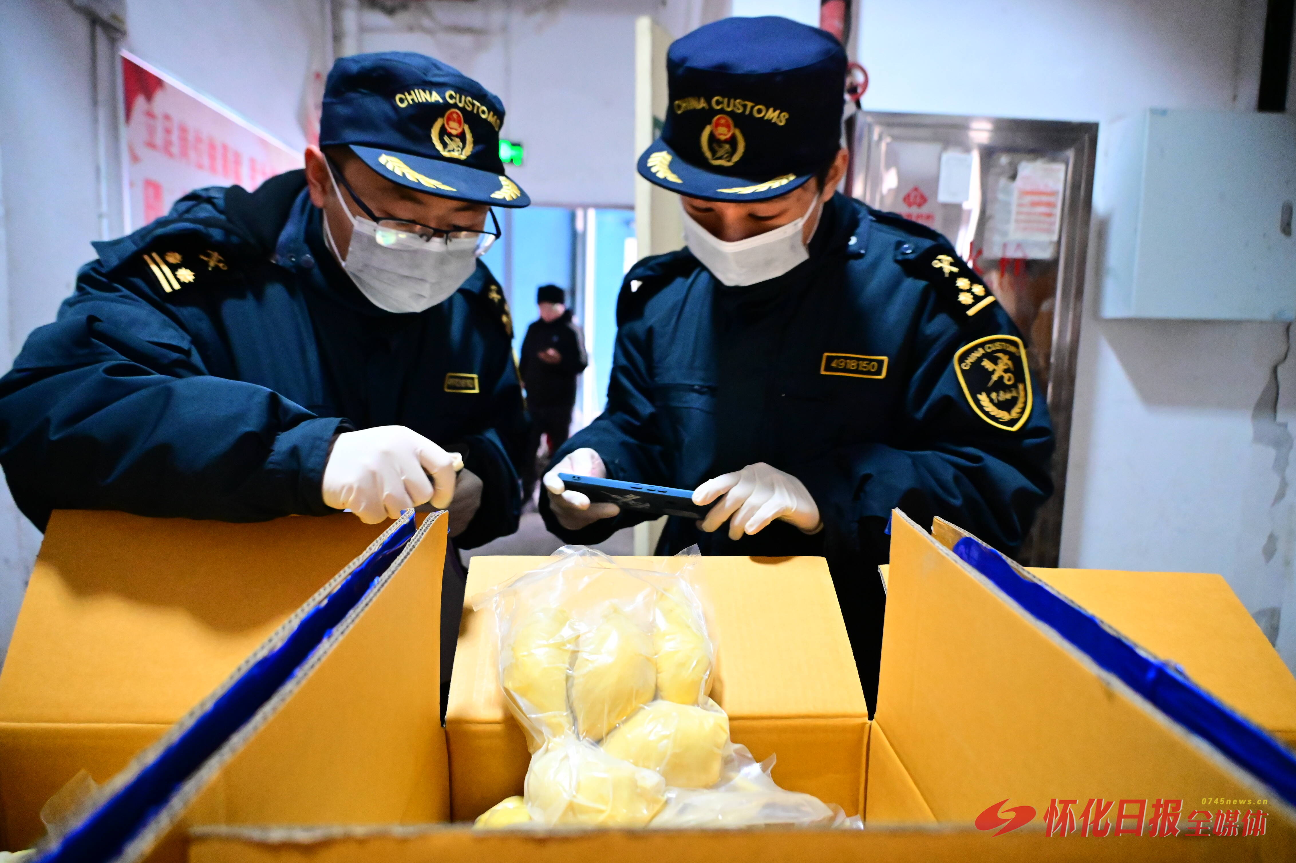 (怀化海关关员正在查验进口榴莲肉 以上照片均由怀化日报全媒体记者 张卓 摄)