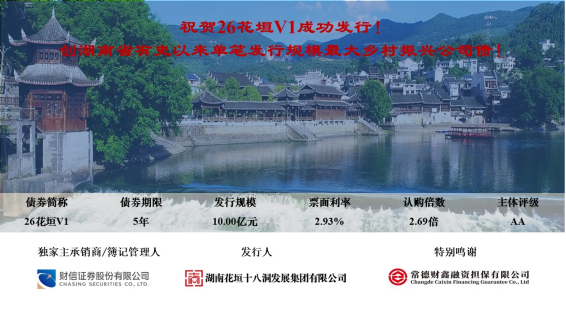 春潮涌动绘“丰”景,金融“活水”润乡野。近日,“湖南花垣十八洞发展集团有限公司2025年乡村振兴公司债券”于上海证券交易所成功发行。这只规模10亿元、期限5年的债券,不仅创下湖南省乡村振兴公司债券单笔发行规模历史新高,更以2.69倍全场认购倍数、2.93%票面利率赢得资本市场青睐。而这背后,湖南财鑫融资担保有限公司(以下简称湖南财鑫担保)的全额增信与全流程护航,正是债券顺利落地的核心保障与关键推手。