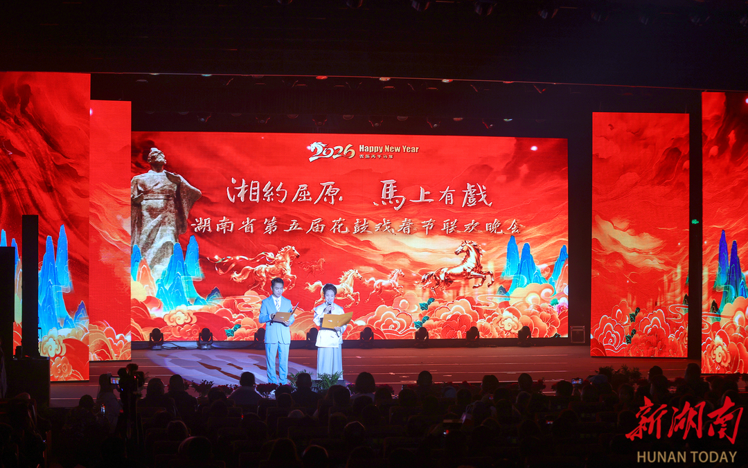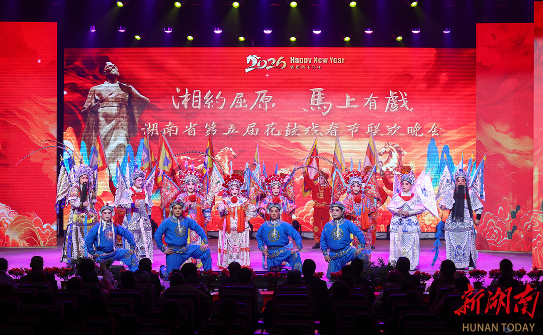 湖南日报•新湖南客户端2月9日讯(记者 张颖琳 通讯员 罗姣 贺轶)花鼓声声辞旧岁,楚韵悠悠贺新春。2月8日晚,以“湘约屈原 马上有戏”为主题的湖南省第五届花鼓戏春节联欢晚会在岳阳市屈原管理区的屈原文化艺术中心举行。晚会通过经典与创新兼备的节目,展现花鼓戏艺术的魅力与活力,为观众献上一场兼具文化底蕴与时代气息的戏曲盛宴。