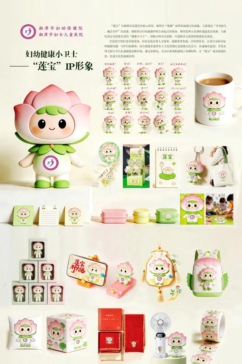 “莲宝”的设计灵感,源于湘潭“莲城”文化底蕴与妇幼健康事业的双向奔赴。粉绿柔和的主色调传递治愈气息,舒展的莲花瓣构成圆润亲和的面部轮廓,头顶含苞待放的花苞象征新生命的孕育与守护,胸前的徽章更蕴含“莲心向党,守护健康”的赤诚初心。
