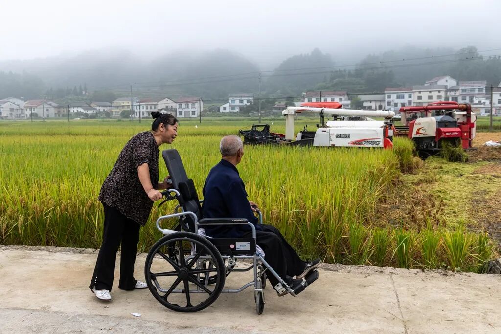 2025年9月28日,岳阳市岳阳县某乡村田间,村民专程来到田边观看现代化机械收割作业,感受农业生产的变迁。