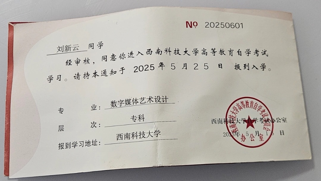 △西南科技大学发给刘新云的入学通知。