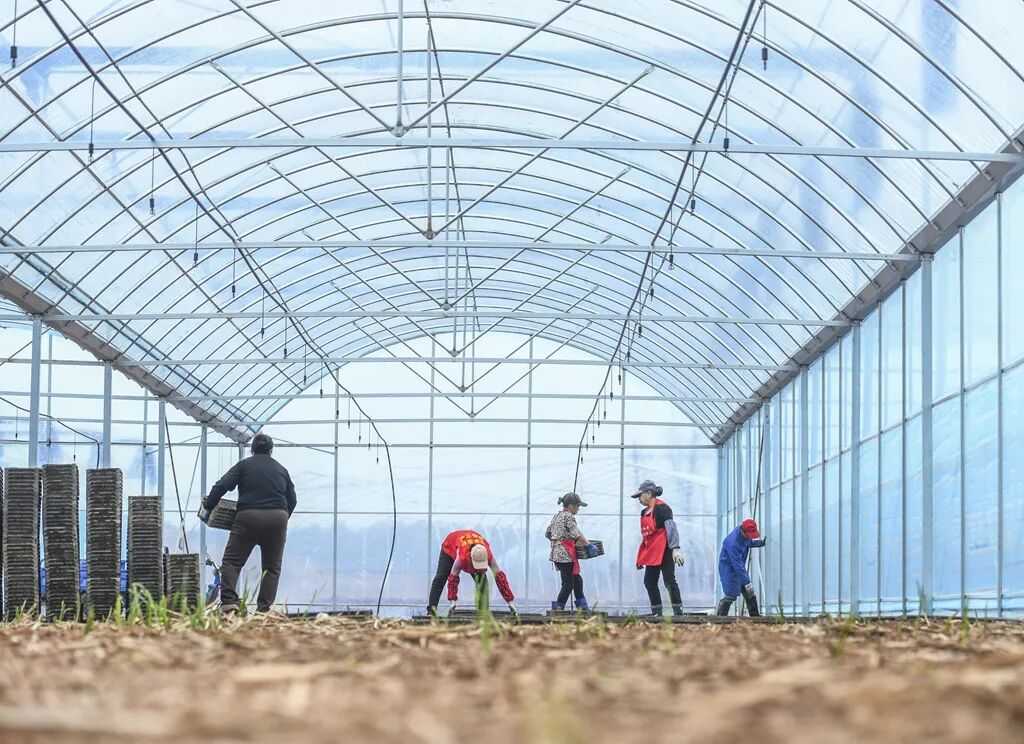 2025年3月10日,道县上关街道东进村,和丰农机专业合作社水稻育秧基地内,村民整齐摆放秧盘,备战春耕。