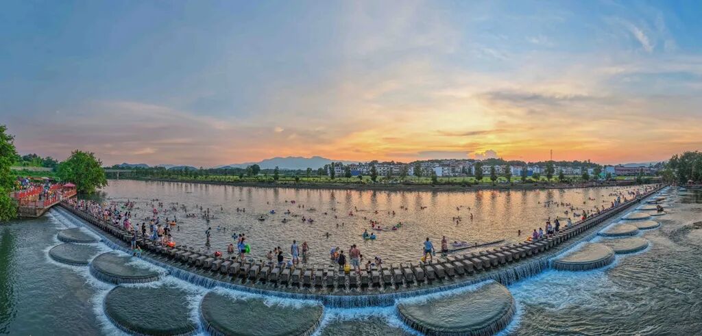 2025年7月8日,道县何宝珍故里景区,市民和游客在洑水河亲水消暑,享受夏日清凉。