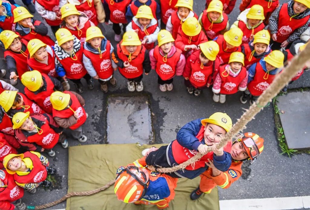 2025年3月31日,道县消防救援大队,小朋友在消防员协助下体验绳索攀爬,学习安全知识。