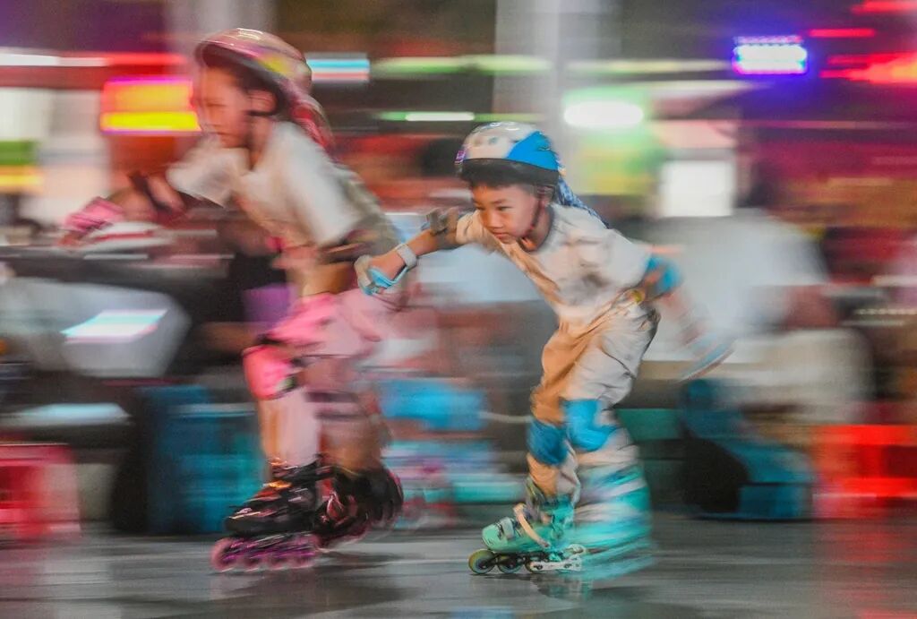 2025年7月12日,道县周敦颐广场,孩子们在老师指导下学习轮滑。