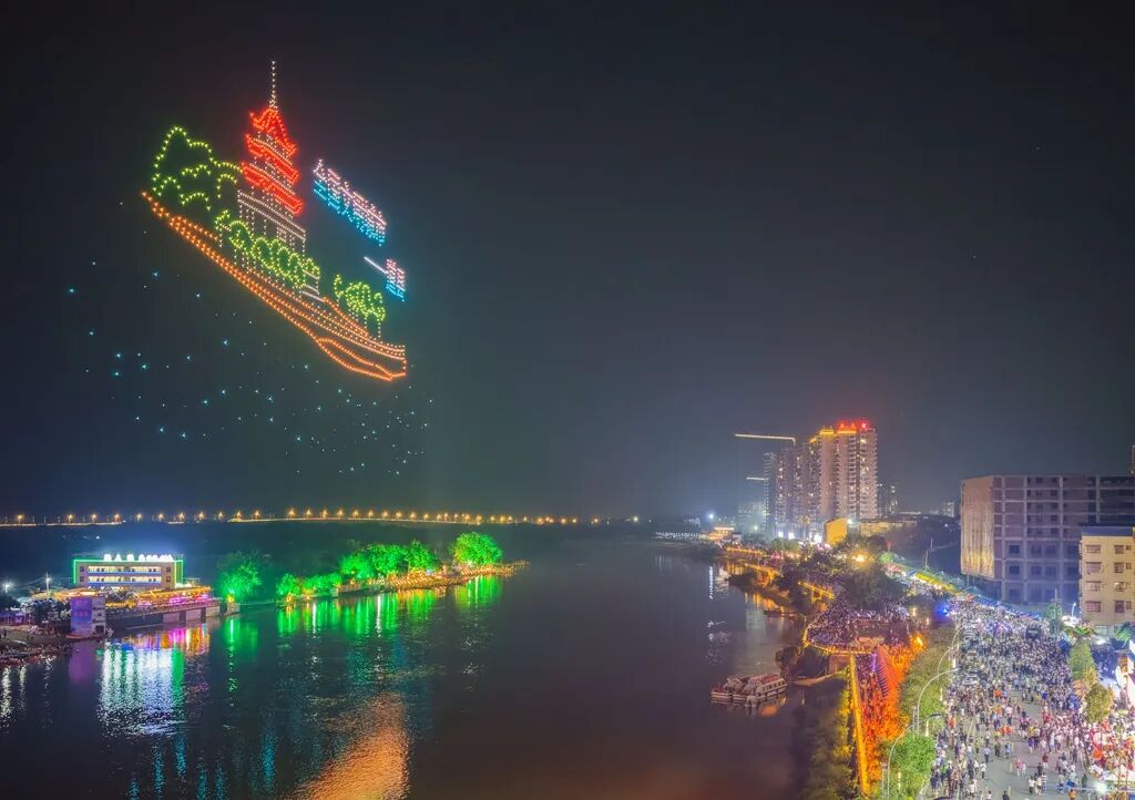2025年5月24日,道县潇水河畔,无人机表演点亮夜空,呈现“千年文脉”主题灯光秀。