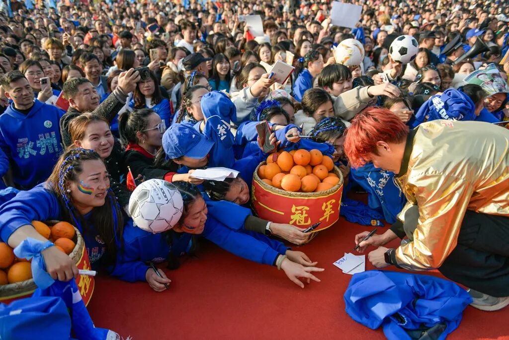 2025年12月30日,道县文体公园,湘超冠军永州队队员为球迷签名,共享夺冠喜悦。