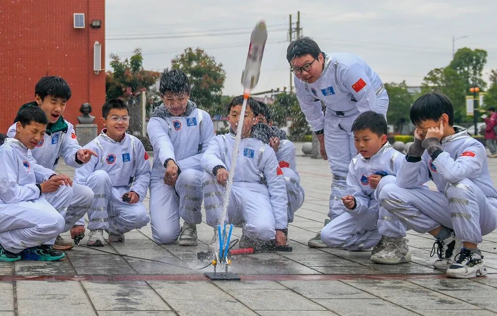 2025年11月18日,道县道州玉潭(东阳)学校,学生们在进行”水火箭“实验展示。