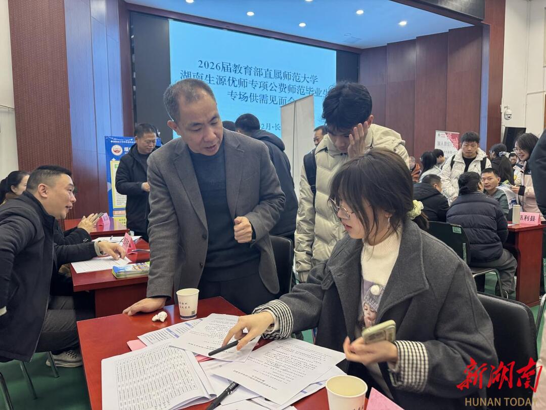 科教新报·新湖南客户端讯(记者 董以良)2月9日上午,长沙市寒意汹涌,湖南省语言文字培训测试中心内却暖意融融,2026届教育部直属师范大学湖南生源优师专项公费师范毕业生专场供需见面会在此举行。来自全省35个脱贫县(市、区)的学校现场提供了234个教师岗位,与79名即将毕业的“优师计划”湖南籍学子面对面洽谈,共同开启了一场连接梦想与家乡的“双向奔赴”。