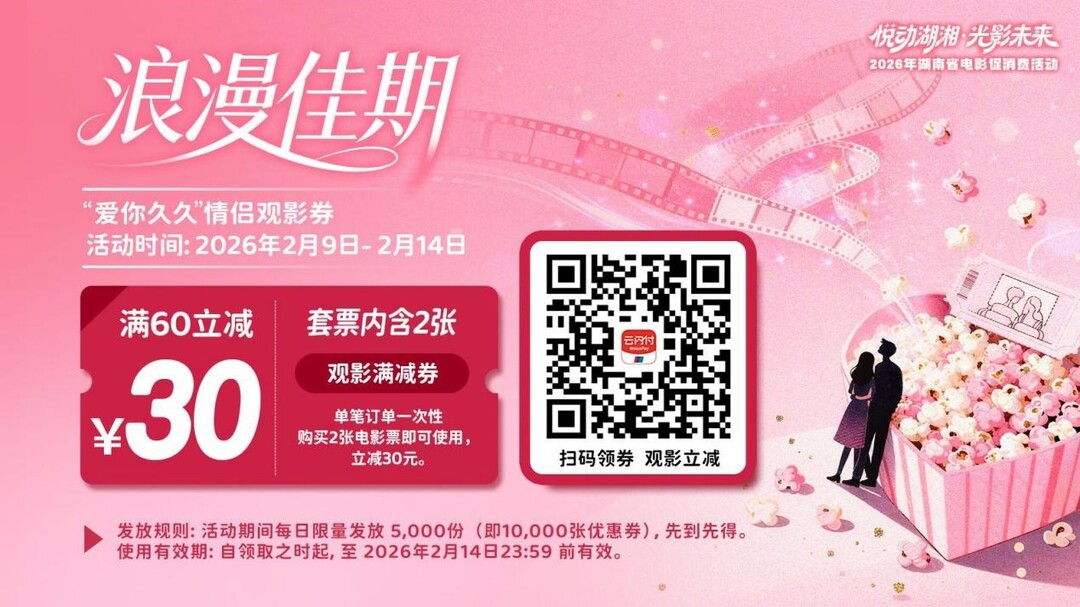 湖南日报·新湖南客户端2月9日讯(记者 邓正可)2月9日至3月3日期间,湖南将推出“浪漫佳期·光影贺岁”电影促消费特别活动,依托云闪付APP平台,分两个阶段发放情侣观影券和家庭观影券,覆盖情人节与春节档期,为市民带来实实在在的观影优惠。
