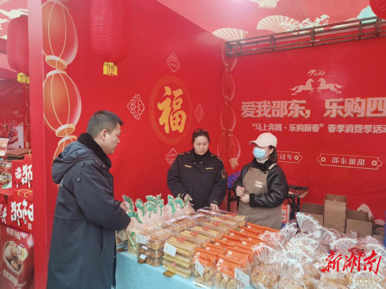 2月7日上午,邵东市在昭阳公园广场举办“爱我邵东,乐购四季”盛大展销会。会场人声鼎沸,商品琳琅满目,空气中洋溢着热闹喜庆的年味。为把好商品的质量关,邵东市市场监督管理局宋家塘所党支部书记带领党员干部穿梭在摊位之间,逐一开展检查。