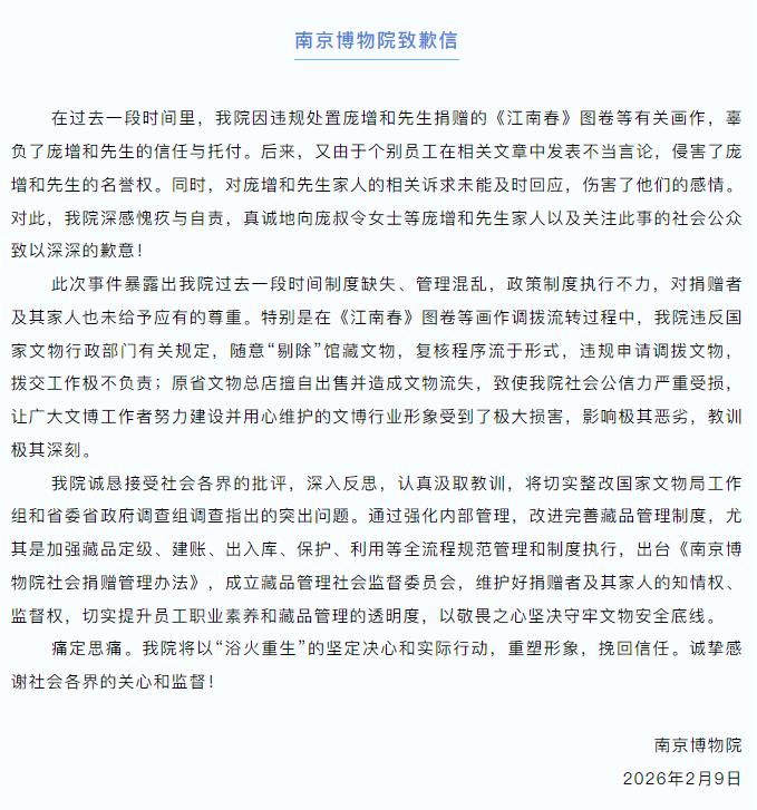 另据南京博物院微信公众号消息,就“违规处置捐赠《江南春》图卷等有关画作”一事,南京博物院2月9日发布致歉信。具体内容如下: