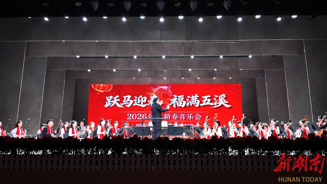 湖南日报·新湖南客户端2月9日讯(记者 周紫云)《春节序曲》的欢快旋律响起,唢呐名曲《百鸟朝凤》引来满堂喝彩……2月9日晚,五溪大地迎来新春音乐盛宴,2026怀化新春音乐会在怀化大剧院精彩上演。湖南民族乐团用富有中国气息的民乐,为当地干部群众献上新春祝福。