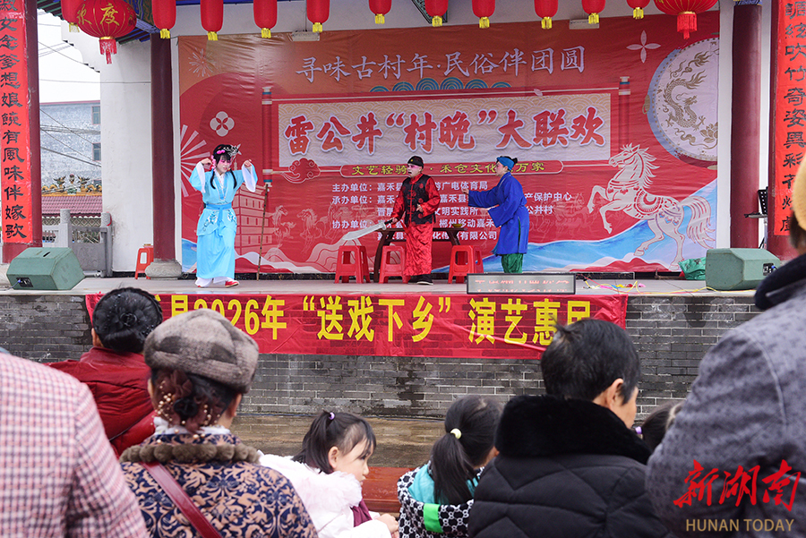 2月8日,嘉禾县雷公井古村,文艺工作者在表演节目。春节前夕,该县文化馆开展“送戏下乡 文艺惠民”活动,文艺工作者为村民带来歌舞、花灯戏等精彩节目,营造喜庆祥和的节日氛围。 黄春涛 摄(湖南图片库)