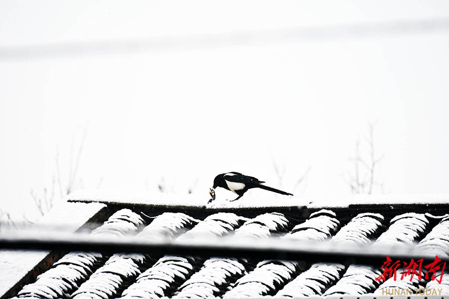 2月9日,澧县澧澹街道民堰村,一只喜鹊在农家屋脊上寻找筑巢材料。当天,该县迎来立春后首场降雪,银装素裹的村庄更添一份宁静祥瑞的节日氛围。 柏依朴 摄(湖南图片库)