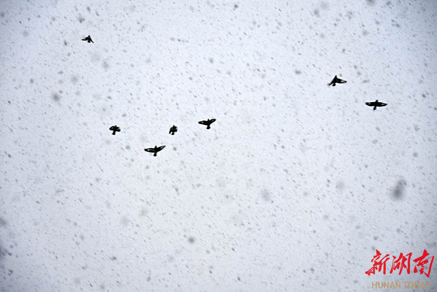 2月9日,澧县澧澹街道民堰村,一群小鸟在雪中飞翔。当天,该县迎来立春后首场降雪,银装素裹的村庄更添一份宁静祥瑞的节日氛围。 柏依朴 摄(湖南图片库)