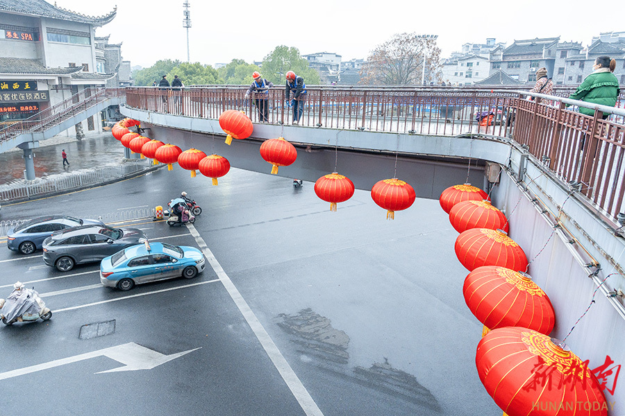 2月9日,吉首市乾州街道人民路人行天桥,工人冒雨安装节日灯笼。春节前夕,该市在城区主要场所通过悬挂灯笼等红色装饰,营造出喜庆祥和的节日氛围。 梁永鸿 摄(湖南图片库)