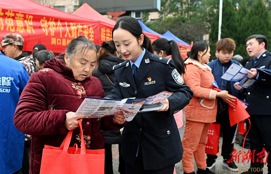 2月9日,民警在向群众宣传如何防范电信网络诈骗等常识。连日来,洞口县公安局组织志愿者深入乡村、街道开展防范金融诈骗宣传活动。民警通过案例讲解、资料发放等方式,向群众普及防诈知识,提升群众安全防范意识。 滕治中 摄(湖南图片库)