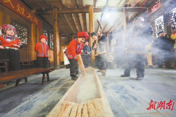 2月9日,湘西土家族苗族自治州龙山县召市镇神州社区马洛沟村,村民在打糍粑。