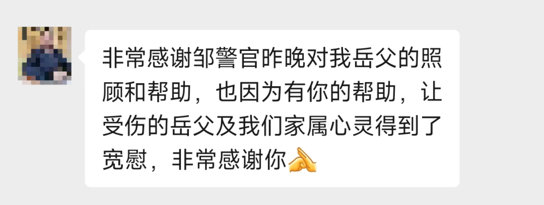 “因为有你的帮助,让受伤的岳父及我们家属心灵得到了宽慰,非常感谢你。”隔天,得知事情完整原委的老人家属特地给邹鸿鹄发来短信致谢。