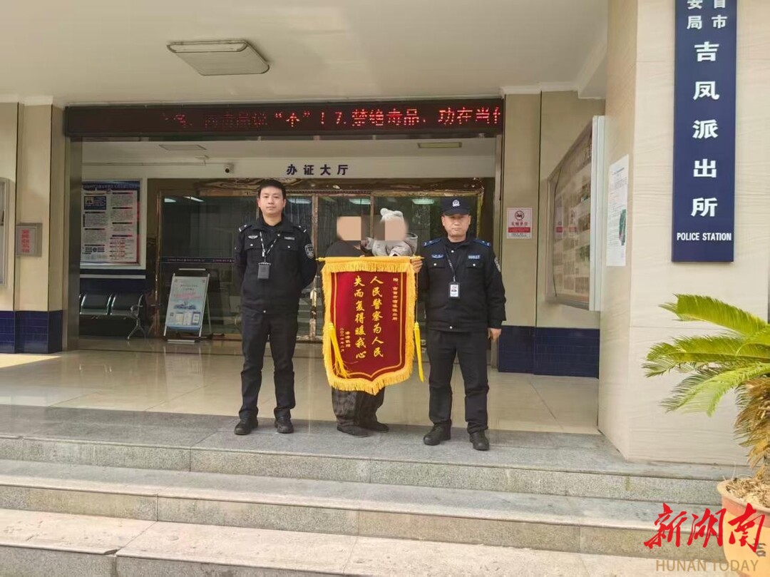 新湖南客户端2月10日讯(通讯员 张馨予 张红军)2月6日,湘西土家族苗族自治州吉首市公安局吉凤派出所一楼接警大厅暖意融融。辖区居民潘女士将一面写着“人民警察为人民,失而复得暖我心”的锦旗,送到值班民辅警手中,感谢他们帮自己找回丢失的价值15万元的黄金首饰。