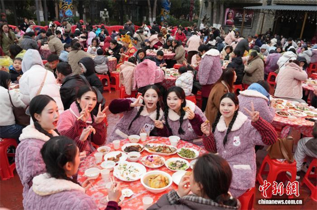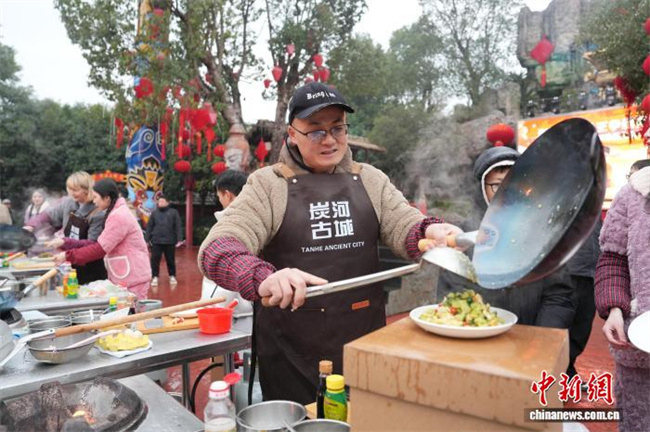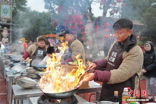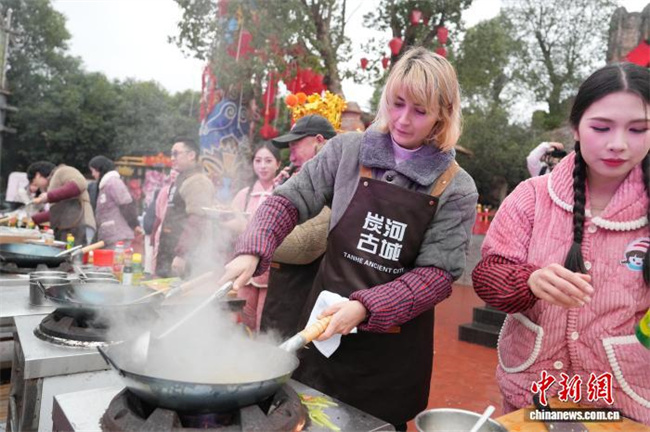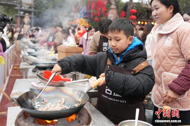 On February 7, Tanhe Ancient Town in Ningxiang City, Hunan Province, hosted the Spring Festival Kitchen God Competition, where Chinese and international contestants competed side by side to showcase their culinary skills. Participants prepared authentic Chinese delicacies on the site, exchanged insights on Chinese culinary culture, and celebrated the arrival of Chinese New Year together. The photo shows numerous contestants demonstrating their cooking skills. (Photo/Yang Huafeng, Chinanews)