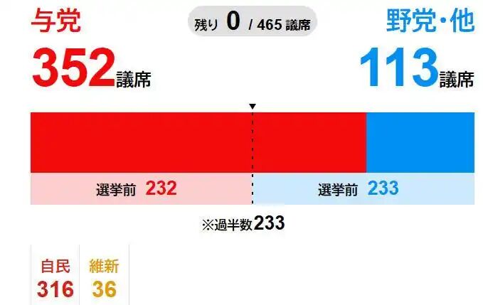 日本众议院选举投票最终结果 NHK截图