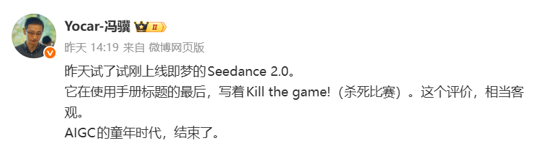 2月9日,《黑神话:悟空》制作人也发文分享了自己测试Seedance2.0的感受:杀死比赛。
