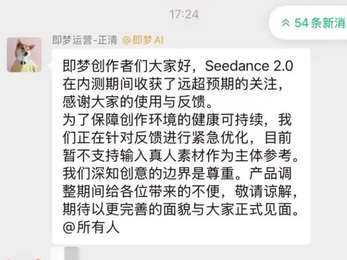 面对隐私争议,2月9日,平台运营人员在即梦创作者社群中发布消息称:“Seedance2.0在内测期间收获了远超预期的关注,感谢大家的使用反馈。为了保障创作环境的健康可持续,我们正在针对反馈进行紧急优化,目前暂不支持输入真人图片或视频作为主体参考”,并表示平台深知创意的边界是尊重,产品调整后会以更完善的面貌与大家正式见面。