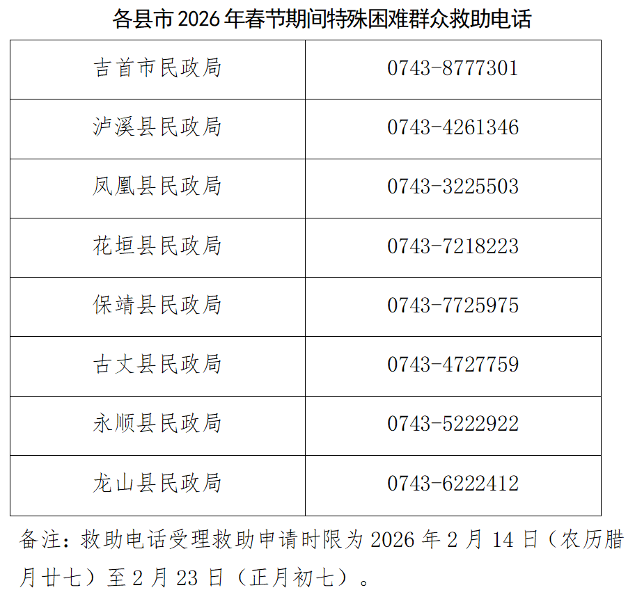 (一)救助时限。救助申请集中受理时间为2026年2月14日(农历腊月廿七)至2月23日(正月初七)。