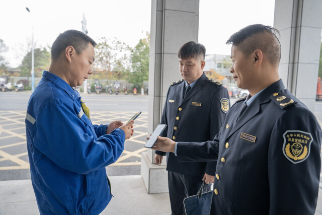 2025年12月3日,衡阳市雁峰区的特变电工(湖南)能源建设有限公司,应急管理执法人员向企业展示审批通过后的二维码。湖南日报全媒体记者 李健 摄