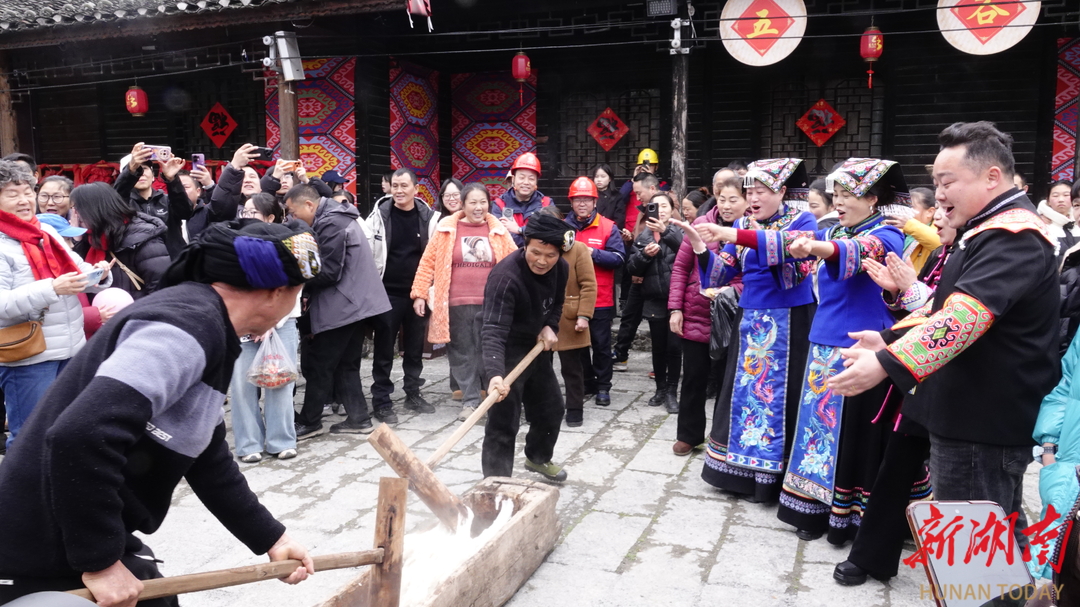 “打粑粑,打粑粑,趁热揉,赶快打……”欢快的土家民歌《粑粑哈》响彻古寨,瞬间吸引众人目光。土家儿女身着传统服饰,一边高歌一边助力打糍粑,游客们情不自禁跟着哼唱,孩子们更是迫不及待上前体验。踩糍粑环节中,萌娃们站上案板蹦跳嬉戏,巨型糍粑承载着团圆美满、幸福安康的新春祝福,送给在场的每一位游客。