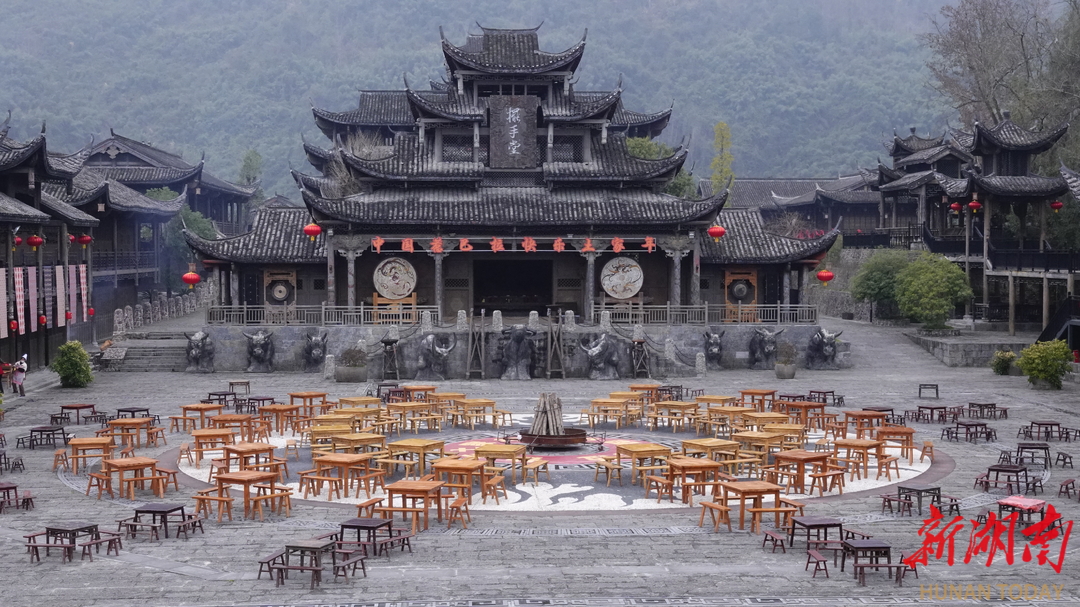 惹巴拉宫内,“天下第一”土家八仙宴沿篝火铺开,游客们围桌而坐,满心期待。牛角号吹响,祭祖祈福仪式庄重开启,祈求来年风调雨顺、五谷丰登。