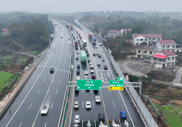 2月9日下午,沪昆高速醴陵段王仙枢纽,最右侧往醴娄高速的匝道刚刚放开,车辆慢慢分流。湖南日报全媒体记者 赵持 摄