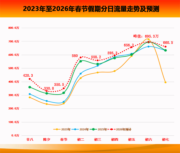 2026年春节假期的高速公路流量变化趋势总体呈现:“前低后高、逐日攀升、高峰缓降、多日聚集”特征。路网车型以小型客车探亲出行为主。除夕、初一路网流量相对平稳;正月初二至初四,短途探亲车流增长迅猛,逐日走高,形成以小型客车为主的短途密集探亲车流;正月初五开始将进入跨省返程车流高峰期;初六至初七,各县市、乡镇车流向重点城市为中心汇聚,呈现返程高峰,由南往北、西往东方向车流,潮汐特征明显。正月初六达到流量最高峰,峰值流量为695万辆,春节期间出程与节日后期返程的潮汐特征明显。