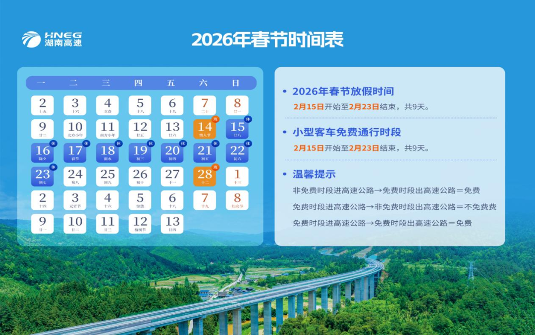 2026年春节假期小型客车免费通行时段起止时间为2月15日(腊月廿八)00:00至2月23日(正月初七)24:00,共9天。