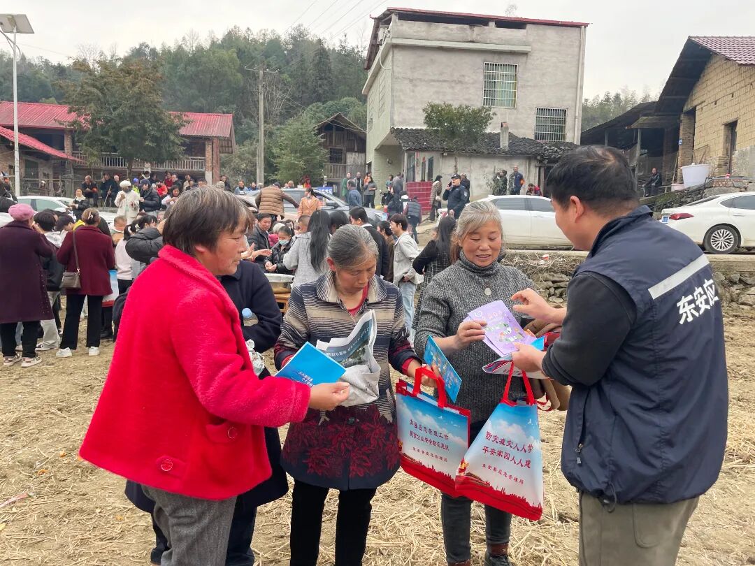 近日,东安县应急管理局工作人员和志愿者深入村组和集会活动场所开展安全知识教育宣传,通过发放宣传单、赠送宣传小礼品的方式,向村民讲解预防一氧化碳中毒和“小火亡人”以及用电安全、交通安全等知识。