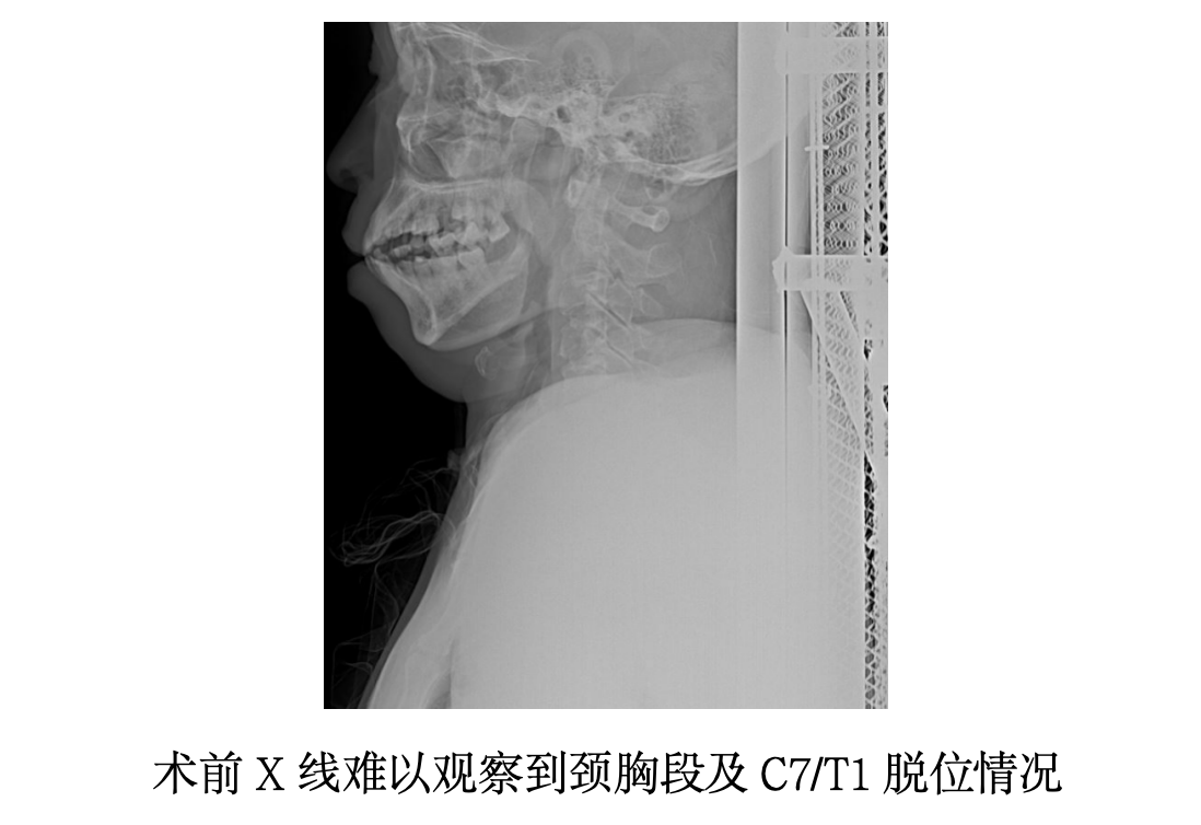 然而,术中牵引复位效果不佳,前路暴露至椎前筋膜时仍可触及明显“阶梯感”,且由于胸骨、锁骨和肩胛骨的遮挡,术中C臂机无法清晰显示脱位情况,继续操作风险极高。