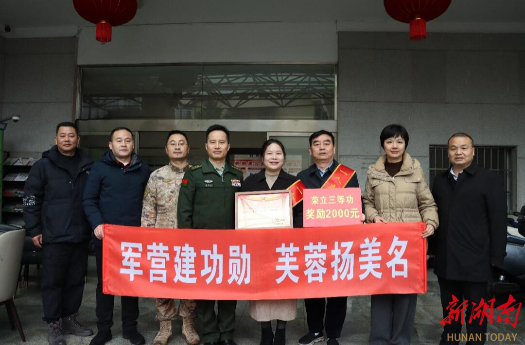 湖南日报·新湖南客户端2月11日讯(通讯员 陆吉涛 黄紫伊)2月10日上午,由长沙市芙蓉区区委、区人民政府、区人武部及街道相关负责人组成送喜报小组,为芙蓉区一名荣立二等功,一名荣立三等功的现役军人送去喜报、牌匾和奖励金。