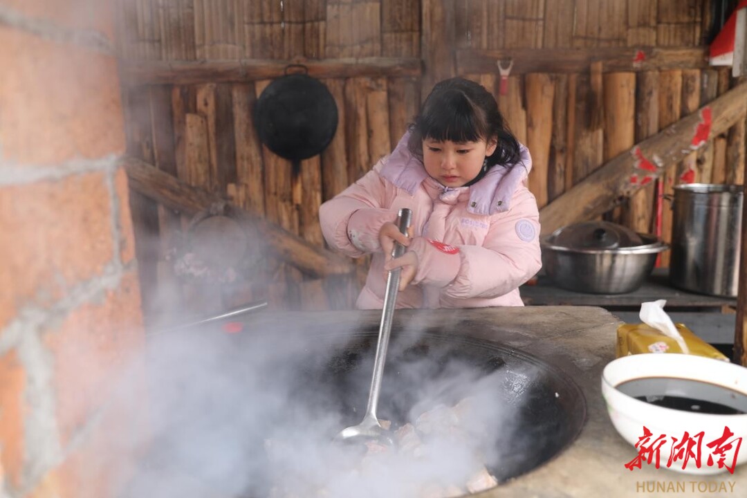 新湖南客户端2月11日讯(通讯员 杨瑞宇 田为 张学为)“慢慢下锅,翻炒要匀!”伴随着家长的贴心指导,岳阳小学学生周奕含将手工豆腐缓缓放入大锅,白嫩的豆腐在铁锅中滋滋作响。2月10日,湘西土家族苗族自治州保靖县“神秘湘西过大年・村厨村艺万家欢”少儿村厨劳动教育实践活动,在村厨村艺大晒场热闹启幕,孩子们与家长携手烹煮湘西年食,在烟火气中体验劳动乐趣,感受年味。