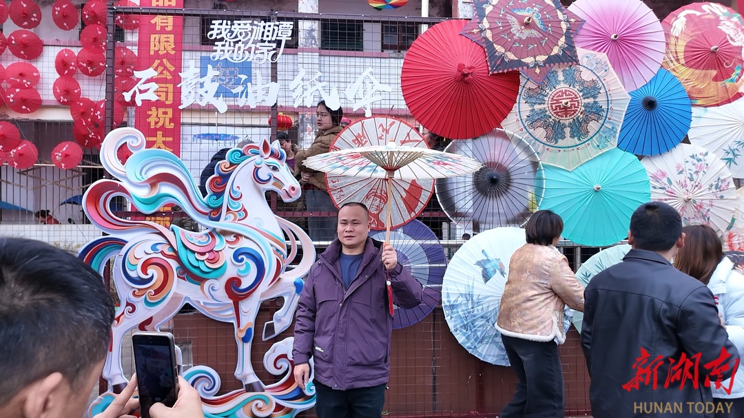 石鼓油纸伞是省级非物质文化遗产,已传承六百余年。活动特别设置油纸伞文化展示区,精品陈列与匠人直播间吸引众多游客驻足。“重返少年时”合影区以课桌椅、老课本、校训等怀旧元素,结合油纸伞、春联等新年道具,唤醒集体记忆。汉服巡游队伍手持油纸伞巡游,与观众亲切互动。2025年,石鼓油纸伞产业中高端产品成功量产,全镇总产值突破3.4亿元,带动8000余人就业,这把“非遗伞”已成为乡亲们奔向幸福生活的“致富伞”。