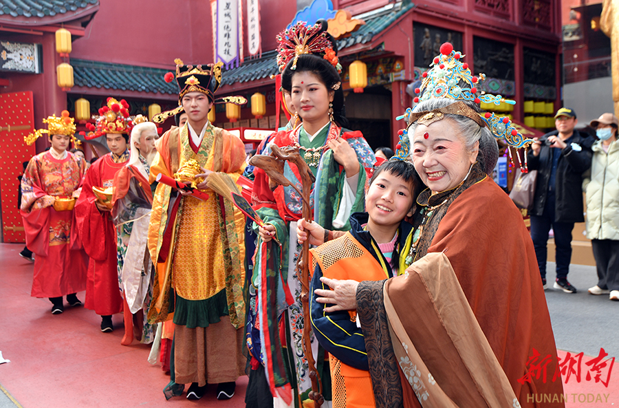 2月11日,长沙市坡子街火宫殿,“八大福气使者”与市民互动。当天,由新湖南客户端指导发起,长沙市芙蓉区文旅体局主办,湖南省圆点美术馆承办的“开门见喜 福满星城”2026长沙新年画城市共生计划欢乐开启。“八大福气使者”通过巡游派福,将非遗年画艺术融入城市空间,为市民游客带来新春文化新体验。湖南日报全媒体记者 田超 童臻熙 摄影报道