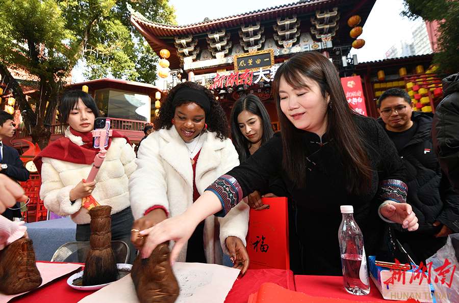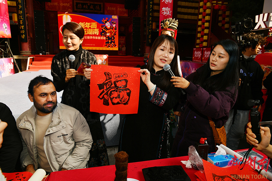 2月11日,长沙市坡子街火宫殿,外国友人在体验年画拓印。当天,由新湖南客户端指导发起,长沙市芙蓉区文旅体局主办,湖南省圆点美术馆承办的“开门见喜 福满星城”2026长沙新年画城市共生计划欢乐开启。“八大福气使者”通过巡游派福,将非遗年画艺术融入城市空间,为市民游客带来新春文化新体验。湖南日报全媒体记者 田超 童臻熙 摄影报道