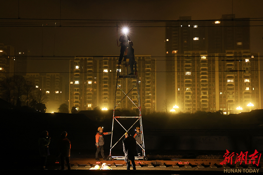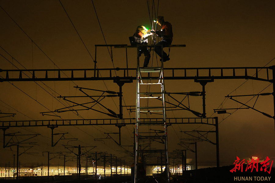 2月11日凌晨,中国铁路广州局集团有限公司怀化供电段员工在怀化南站开展高铁供电线路检修作业,保障春运期间铁路运输安全。柴均林 贺珊珊 摄影报道(湖南图片库)