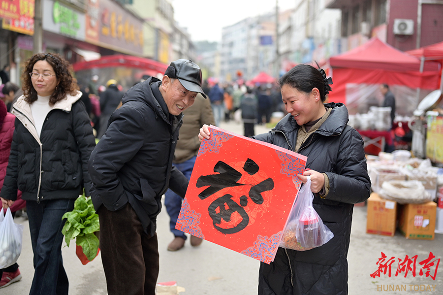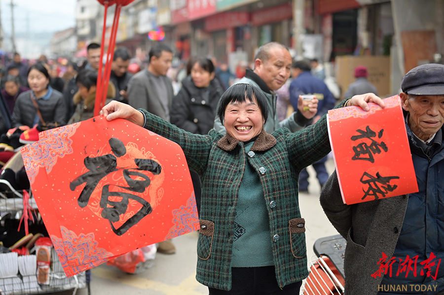 2月8日,村民开心地展示刚领到的福字。当天,双峰县井字镇在集市上举行“迎新春、送春联”惠民活动。书法爱好者现场挥毫,为赶集村民送上手写春联和福字,传递节日祝福。 李建新 摄(湖南图片库)