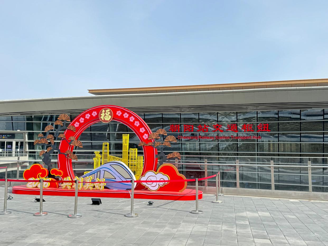 朝阳站西广场,“共朝美好”大型景观将骏马与高铁元素创新融合;丰台站南枢纽换乘大厅,围绕“骋风跃春,驿满新程”主题,引入骏马、祥云等元素,为枢纽披上马年新春的“红妆”。
